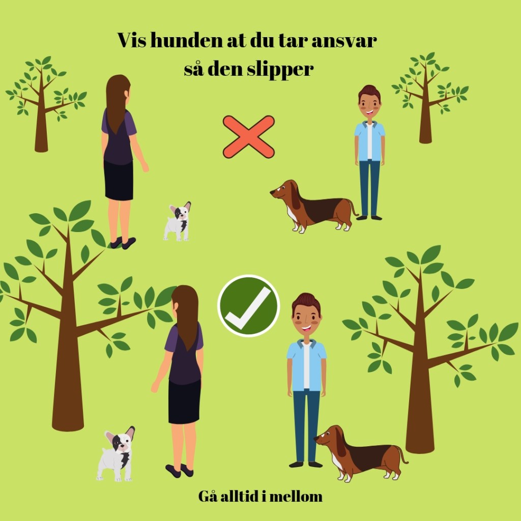 Hvordan går jeg tur? Hvor har jeg hunden min i forhold til den møtende hunden? Når målet mitt er å få hunden min til å føle seg trygg i møte med annen hund, er det viktig at jeg viser praktisk at «jeg er her for å beskytte deg». Et moment som er med på å vise hunden dette, er hvilken side hunden min er på i forhold til den møtende hunden. Jeg går ALLTID MELLOM hundene.